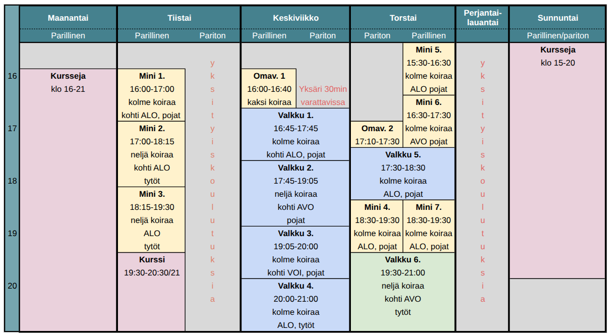 Aiheena on passi/oman vuoron odottaminen ja oikeanlaisen tunnetilan rakentaminen näihin. Päivän aikana minä vedän nome-koulutusta ja Elisa keskittyy passivuorolaisiin. Osa ryhmistä on siten, että keskitytään passiin ns. odotuspaikalla ilman näköyhteyttä suorittaviin koiriin ja osa ryhmistä niin, että keskitytään passiin rivissä toisten suorituksia seuratessa. Ryhmäajat joko 30min pareittain tai 60min neljän koiran ryhmässä.